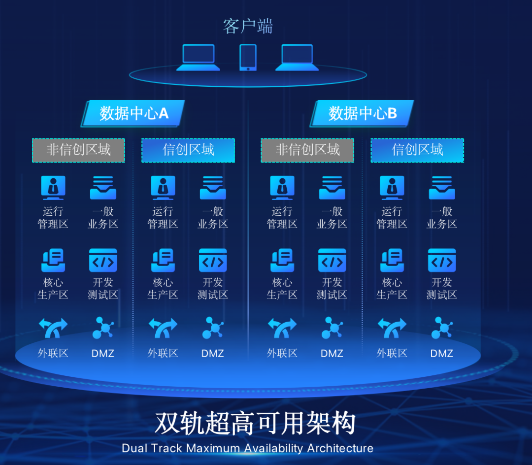 MGM美高梅官网在企业面临自主创新IT基础重构过程中,推出的全新架构双轨超高可用架构(简称DTMAA),在双活数据中心的分区调度基础上,添加每个数据中心内信创域和非信创域的分域调度,来实现分区分域协同的多活双轨超高可用。